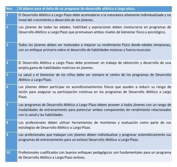 Veamos la lista de pilares de un desarrollo atlético a largo plazo exitoso que propone el posicionamiento de la NSCA (Lloyd et al., 2016):