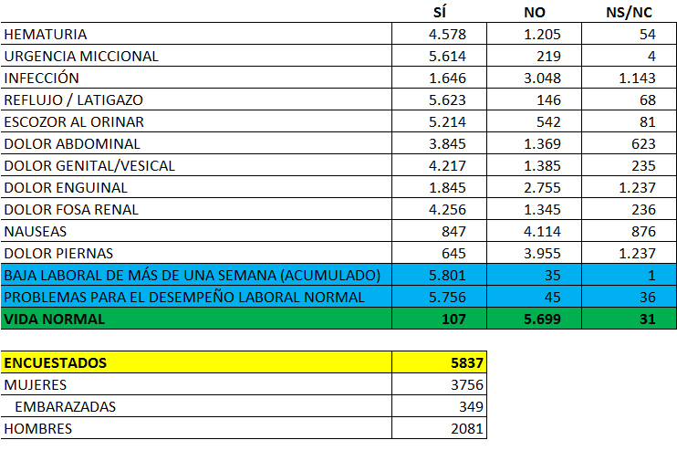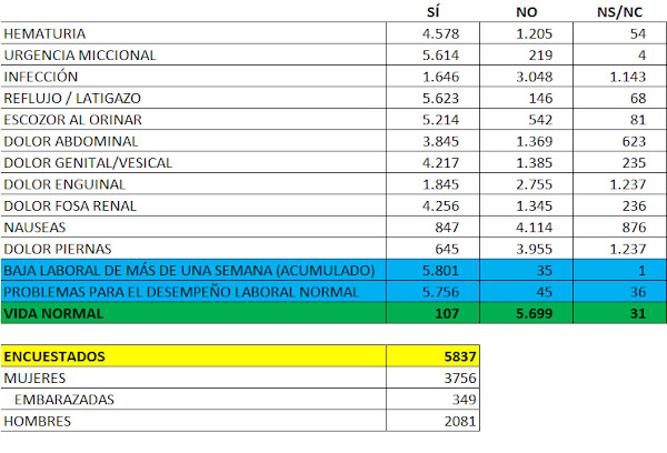 *Son datos recopilados entre visitantes del blog (mediante encuesta, mail y comentarios). Se ha tratado de depurar las votaciones duplicadas a través de la IP y ha quedado un muestra de 5837 encuestados (de los que 3756 eran mujeres -349 gestantes- y 2081 hombres). La pregunta formulada era si durante el periodo que han llevado el catéter doble jota han sufrido alguno de los síntomas expuestos, si han podido trabajar en su puesto habitual y si han hecho vida normal.