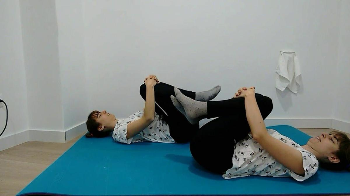 Nos colocamos boca arriba en una colchoneta o en una cama, estiramos el brazo derecho a la altura del hombro, luego pasamos la pierna derecha por encima de la izquierda para que la rodilla derecha toque el suelo,podemos tomarla con la mano izquierda,hacemos presión con la mano por 20 segundos y cambia de lado.Rodillas al pecho