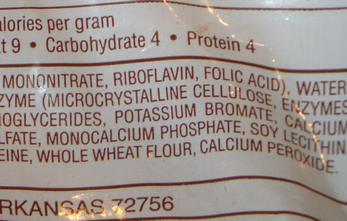 El bromato de potasio es un oxidante que mejora las condiciones de las harinas, y popularmente se le conoce como “mejorador del pan”. Su uso está prohibido internacionalmente por el Codex Alimentarius. Fórmula molecular: KBrO3; Peso molecular:167.01; Características físico químicas: Cristales blancos o gránulos blancos, Punto de ebullición: se descompone a 370ºC, Punto de fusión: 350ºC, Densidad a 20ºC: 3.27 g/cm3, Solubilidad de agua: 133 g/litro a 40ºC y 498 g/litro a 100ºC. Es de fácil confusión con la sal o el azúcar. Ha determinado intoxicaciones por alimentos y bebidas. También es conocido, entre el personal de panaderías, por su efecto sobre el sistema digestivo. Ambas situaciones dan origen a intoxicaciones por error en la adición a la harina. El uso en productos de panificación casera representa un alto riesgo. En Pinamar (Buenos Aires, Argentina), ocurrió una intoxicación alimentaria masiva, con más de 90 afectados en un almuerzo comunitario en 1995. En junio de 1996 en La Plata (Buenos Aires, Argentina) se produjo un brote (n=110) por confusión con sal de mesa.