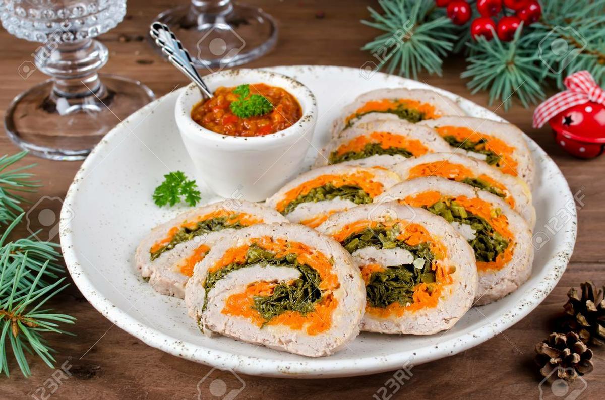 Se colocan las lonchas de jamón york, queso gouda , las espicacas rehogadas , los pimientos asados y la crema de zanahorias y se enrolla atándola con un hilo de cocina. Se rehoga el redondo en una sartén .