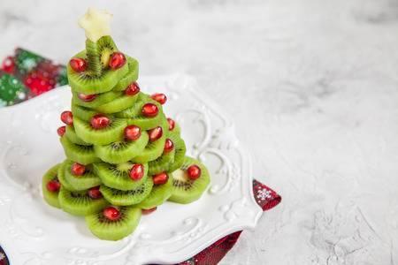 Se pelan los kiwis y se cortan en rodajas y se colocan en un plato en capas con arte para elaborar un árbol navideño.