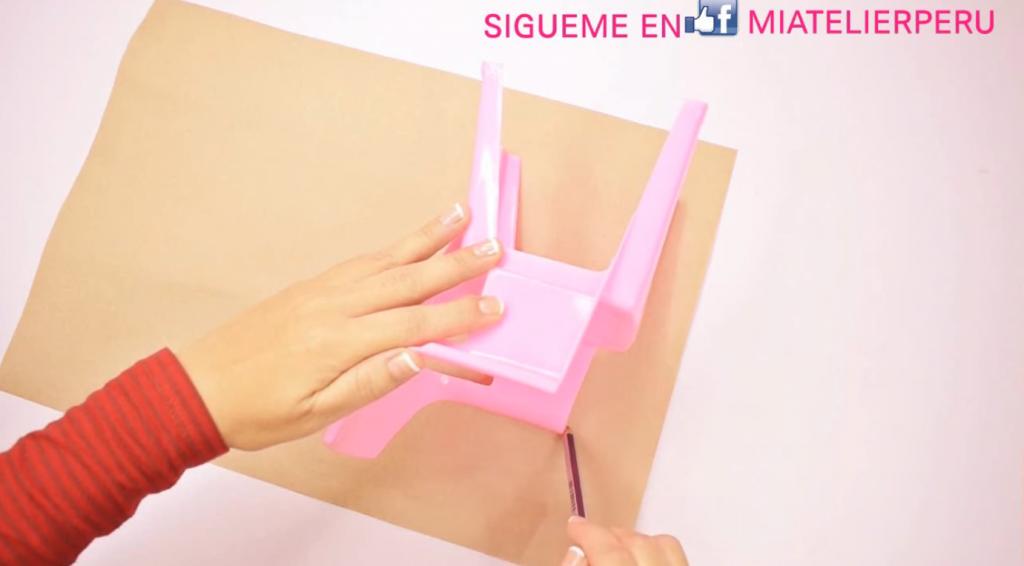 Lo primero que debemos hacer es realizar nuestro propio patrón, o bien, descargarlo desde la página que está arriba (dale un clic al cuadro verde de arriba), busca el patrón correspondiente, descárgalo, imprímelo y recórtalo, tal y como muestra la siguiente imagen debemos de calcar la parte trasera de la silla de plástico, para ello, utilizamos nuestro lápiz o marcador y vamos a marcar todo el filo de la misma.