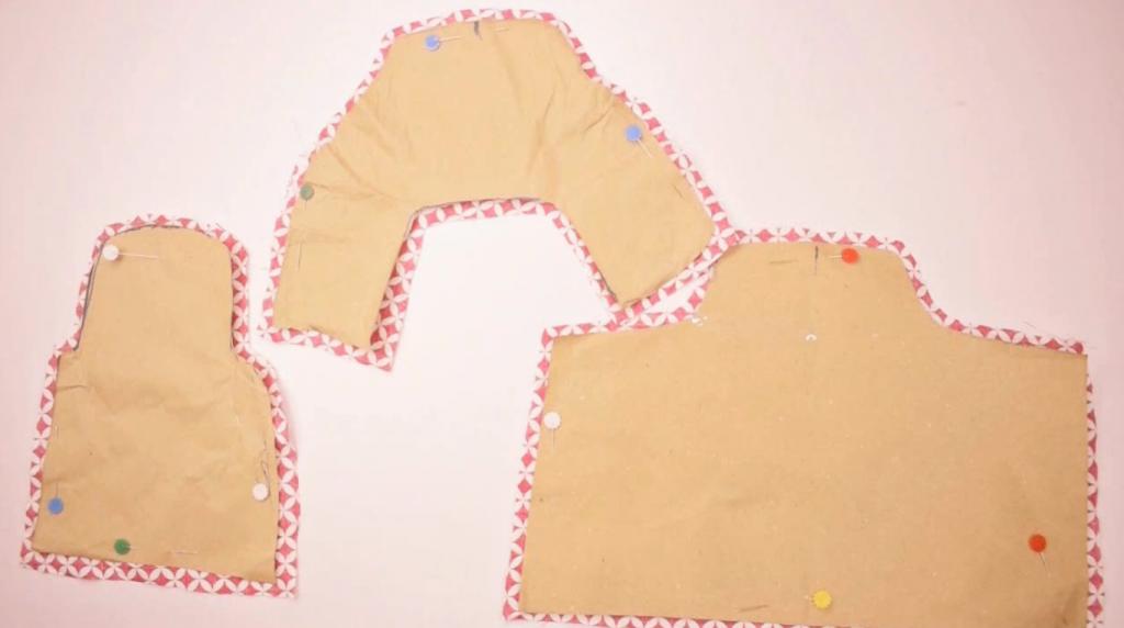 Unidas todas las piezas procedemos a fijar con alfileres, un aspecto a tomar en cuenta es que la pieza no tiene que quedar ajustada, al contrario, debe quedar suelta para quitarla con facilidad. Vamos a realizar un pespunte lineal o sencillo por todo el borde de la pieza, ya sea recta, hilvanado, remallado o como gustes, evita que este se deshilache.