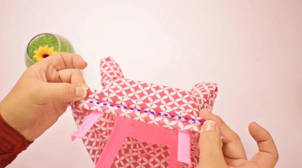 Ahora vamos a hacer la parte de debajo de la pieza, para ello, vamos a realizar un doblez y luego dos, y realizamos una costura para que esta quede cosida y con un mejor acabado. Si seguiste el paso a paso de este tutorial para este forro, este sería el resultado.