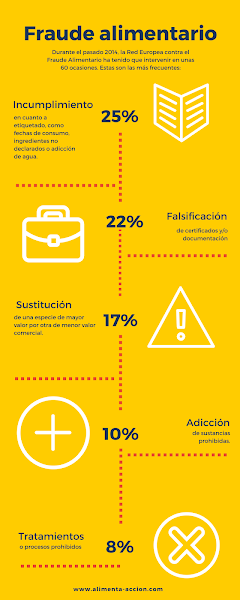 Alegaciones falsas sobre la procedencia de un alimento.A raíz del escándalo de la presencia de carne de caballo en preparados de carne de vacuno en el año 2013, nace la Red Europea contra el Fraude Alimentario (FFN), que este pasado 2014 intervino en unos 60 casos que resumimos en la siguiente infografía: