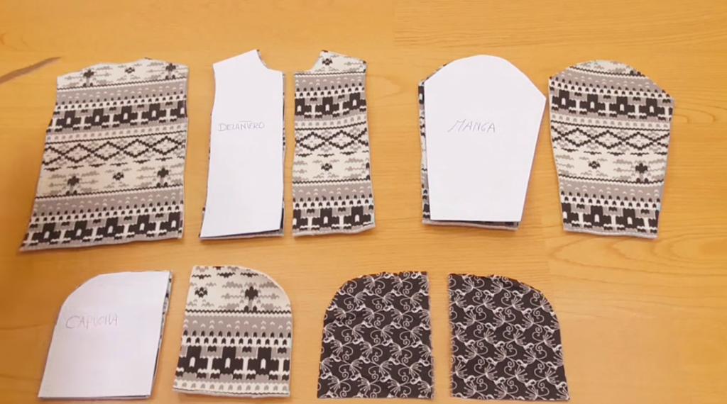 Lo primero que vamos a hacer es ir a la página que se encuentra arriba (clic en el cuadro verde), buscamos el patrón adecuado al patrón, lo descargamos, imprimimos y recortamos. Vamos a recortar 1 pieza del molde de la espalda, 2 piezas de la parte delantera, 2 piezas de la manga y 4 piezas de la capucha (2 tela principal y 2 de forro).