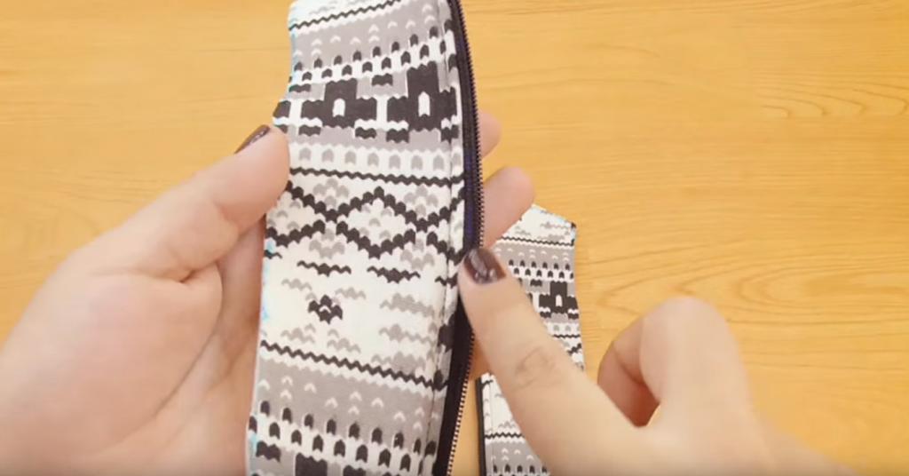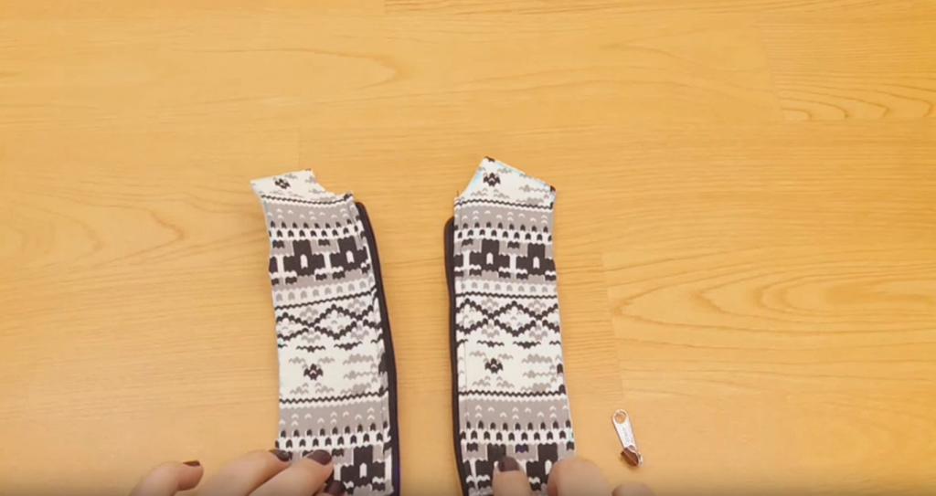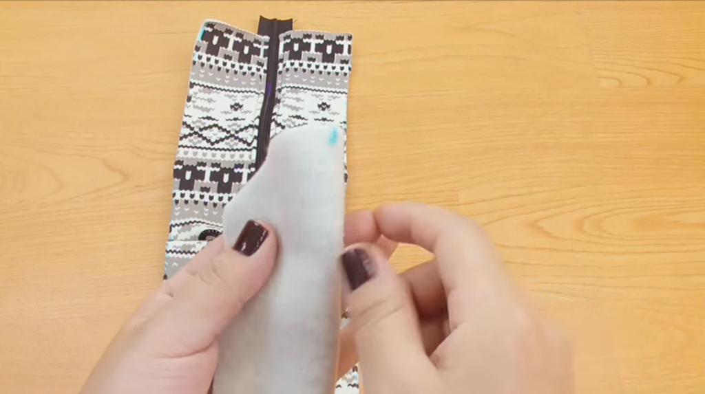Tomaremos nuestro rache o cremallera, lo abrimos y realizaremos un doblez en ambos lados de la siguiente manera y cosemos a mano para que se quede estática en esa posición.