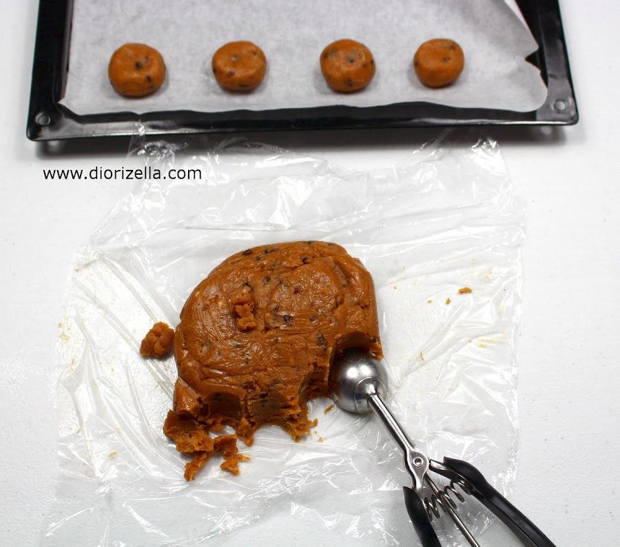 Envuelve la masa en papel transparente de envoltura y coloca la masa en el congelador por 30 minutos. Luego con la ayuda de un cucharon para galletas o tus manos moldea pelotas de masa y colócalas en una bandeja con papel de hornear.