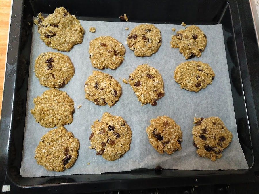 Estas ricas galletas de avena son un gran aporte de fibra. Esta receta es una elaboración básica en la que yo he puesto unas uvas pasas porque me encantan, pero quedarían perfectas también con unos trocitos de chocolate, ralladura de naranja o limón, también puedes ponerle arándanos, un puré de plátano (si haces esto, ponle menos azúcar ya que endulza mucho) y otra idea que me la dio mi hijo, ya después de haberlas hecho cosa que voy a probar, es endulzar con dátiles, sí dátiles, par ello debes hidratarlos durante 10 minutos y después con la batidora hacer una pasta y agregarlo a la mezcla de las galletas, con esto no debes poner nada de azúcar ya que saldrán entonces demasiado dulces.