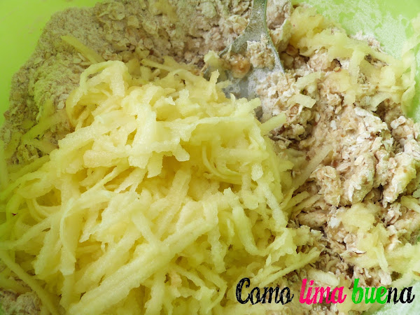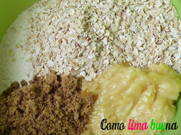 En esta ocasión usamos: 1 taza de avena arrollada (la común) + 1 banana pisada + 1 manzana rallada + algunas cucharadas de azúcar mascabo + un poco de harina leudante.