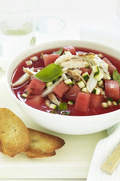 Esta sopa fría ofrece un sabor fresco del verano, que combina productos de temporada como la sandía, el calabacín, el tomate y la albahaca.