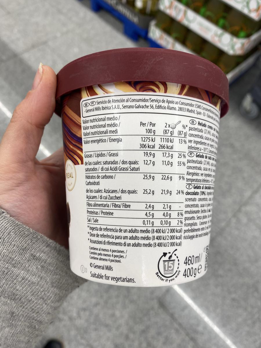 Pero claro, muchas veces pensamosme voy a dar un antojo y paso de los free, me voy a una opción con azúcares. ¿Realmente nos compensa? Vamos a hacer este mismo ejercicio con una tarrina de Häagen-Dazs chocolate belga.