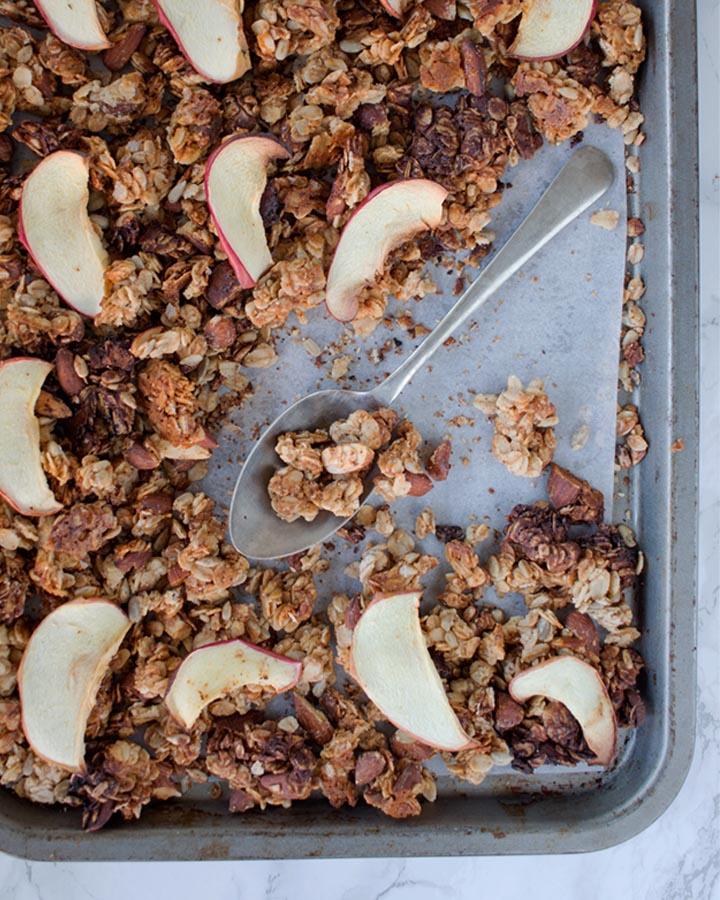 Como toque final se nos ocurrió ponerle unas rodajas de manzana por encima ya que su sabor pega muy bien con la crema de cacahuete. Las rodajas se ablandan en el horno, concentran su sabor, y lo mejor de todo, queda una bandeja de granola preciosa.