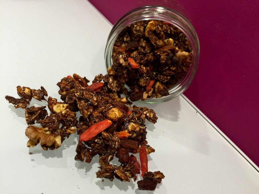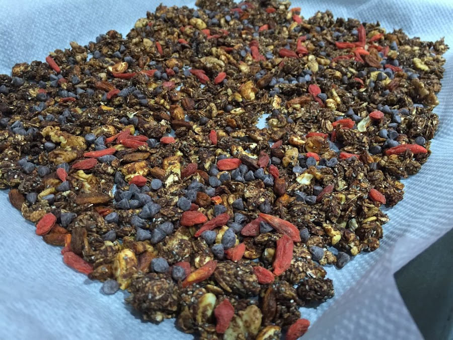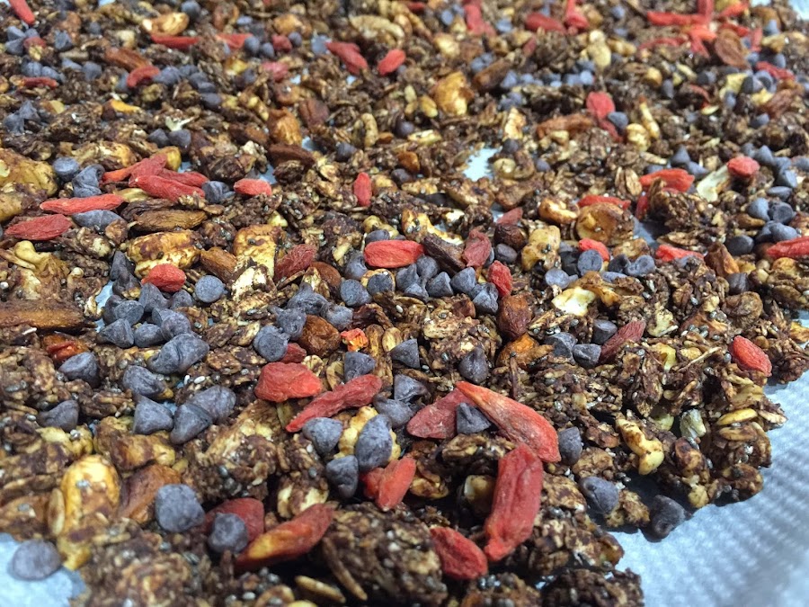 6. Dejamos enfriar por completo y añadimos las bayas de Goji y las pepitas de chocolate.