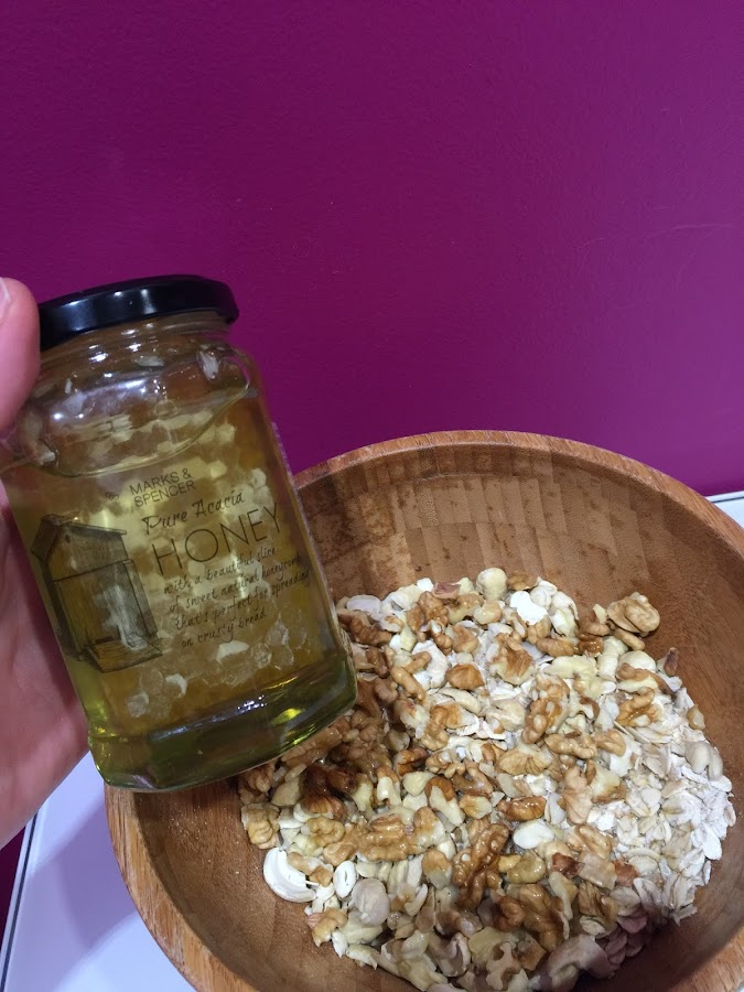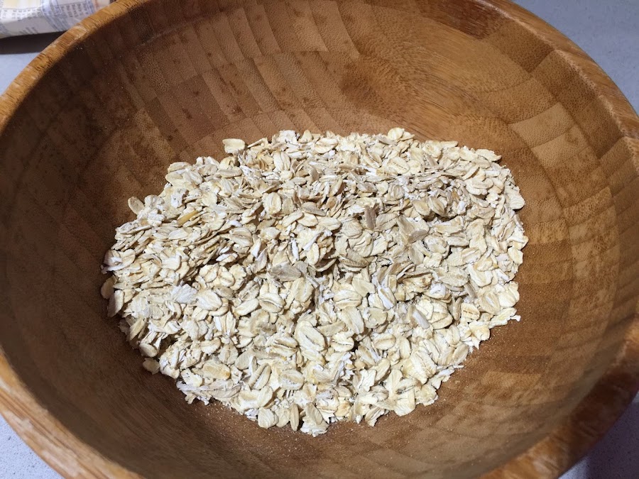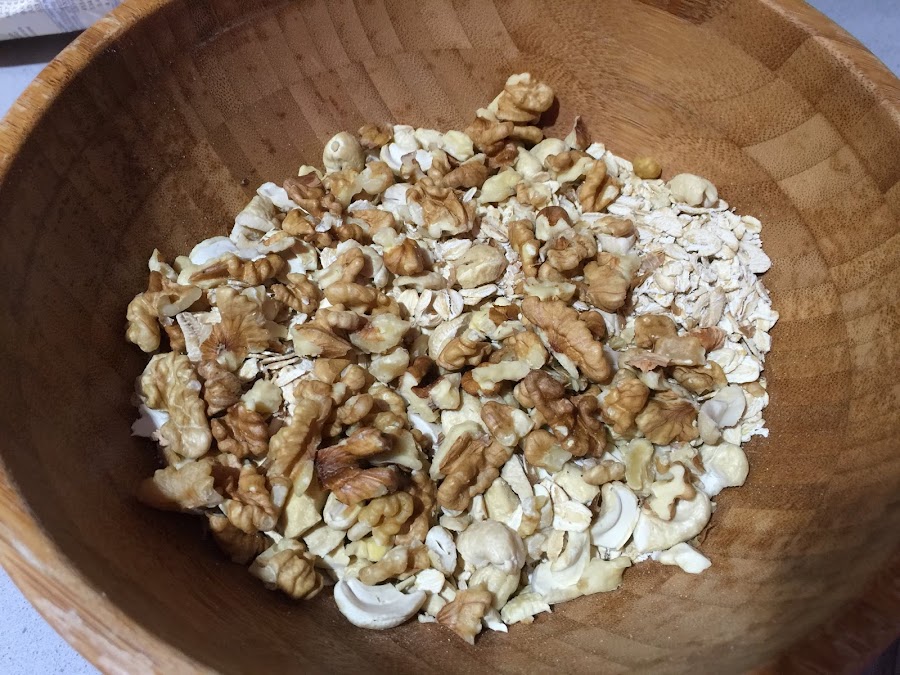 1. Ponemos en un bol los 150g de copos de avena. Troceamos los frutos secos y los añadimos al bol.