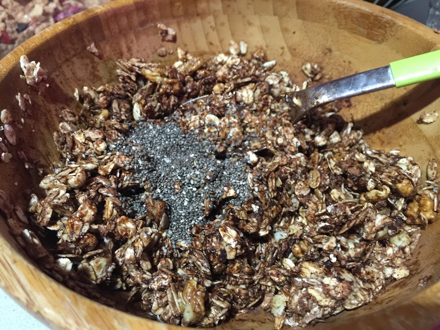 4. Finalmente añadimos las semillas de chía. Yo también añadí las bayas de Goji, pero no os lo recomiendo, al hornear la granola se tostaron demasiado para mi gusto, así que las retiré y las volví a añadir una ves horneado.