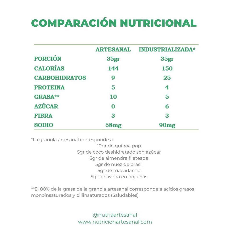 La granola industrializada tiene mayor cantidad de carbohidratos 25gr vs 9gr de la granola artesanal.