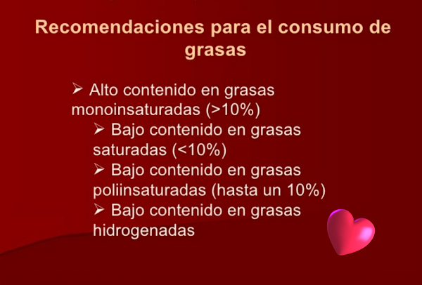 Por tanto, para reducir el riesgo cardiovascular lo ideal es disminuir el aporte de grasas saturadas (aproximadamente <10%) y de ácidos grasos trans (<1%).