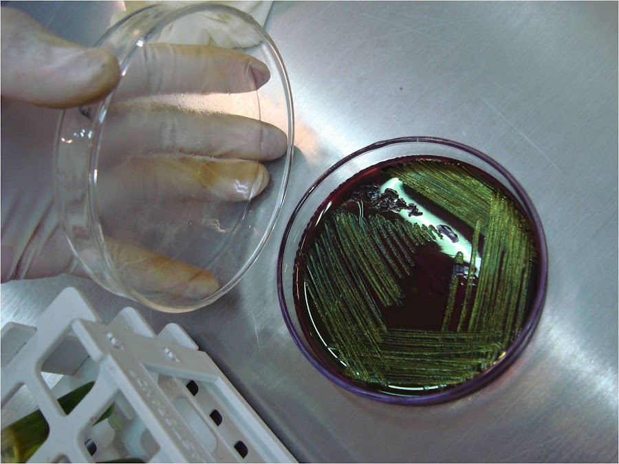Otros medios son selectivos y diferenciales como el VRBG (Violeta rojo bilis glucosa) para la determinación del género Enterobacteriaceae. De esta forma, con la composición de ese medio, crece el género nombrado anteriormente pero no la gran mayoría de los demás ya que o no contiene todos los nutrientes necesarios para el resto o bien contiene algún elemento que les impide el crecimiento. Lo ideal sería que existieran medios que permitieran crecer únicamente al microorganismo cuya determinación se lleva a cabo, pero esto suele ser un ideal que no se suele alcanzar y las pruebas microbiológicas suelen ir acompañadas de confirmaciones bioquímicas para asegurar que la determinación se ha realizado sobre el microorganismo que interesa. En este caso, el análisis se realiza con PCA y se suele llevar a cabo con una dilución del orden de 10-5 aunque es variable según el tipo de alimento. En primer lugar se toman 25 g. de una muestra representativa del producto total si es que éste es sólido, y se añade 225 ml. de agua peptonada en una bolsa estéril de Stomacher, y tras someterlo a homogenización, ya tenemos lista la dilución 10-1 de la muestra. A continuación, se realiza tantas diluciones como sean necesarias tomando 1 ml. de la dilución anterior y anadiéndola a un tubo de ensayo que contenga 9 ml. de suero fisiológica y así sucesivamente. Es muy importante que antes de que se tomen las muestras para verterlas bien en otro tubo de ensayo o bien en una placa de Petri, se homogenice bien la muestra ya que los microorganismos tienden a concentrarse en la parte baja del habitáculo donde se encuentran por sedimentación. Se toman tantas pipetas estériles como diluciones sea preciso realizar. En el caso de la siembra en masa, se vierte el ml de muestra en la placa de Petri y a continuación se vierten unos 15 ml de PCA líquido que está contenido en una botella que está en baño para que se mantenga a temperatura superior a su punto de fusión. A continuación, se homogeniza moviendo la placa de Petri en el sentido de la agujas del reloj y al contrario, y en forma de cruz. Y a continuación se deja reposar hasta que se solidifique el agar por disminución de su temperatura a la del ambiente. Finalmente, se invierte la placa para que no se produzca condensación y se introduce en una estufa a 30ºC que es la temperatura óptima de crecimiento para lo que pretendemos determinar durante 72 horas. Pasado este tiempo, se saca la placa de la estufa y se hace un recuento de las colonias. Cuando se ha vertido el ml. de muestra sobre la placa de Petri, en ella están contenidos un número determinado de microorganismos que no son apreciables a la vista.