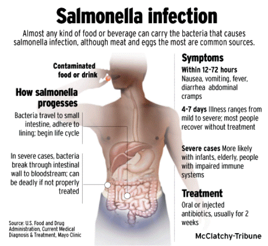 Es la segunda causa más común de enfermedades transmitidas por alimentos. Es responsable de millones de casos al año de enfermedades transmitidas por alimentos; Origen: huevos crudos y mal cocidos, pollos y carnes mal cocidas, productos lácteos, mariscos, frutas y vegetales. Los alimentos comúnmente asociados a intoxicaciones son: