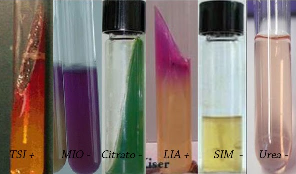 g) Ureasa. De las colonias sospechosas (del agar SS o del XLD) se siembra en superficie en un tubo de agar Urea incubándose a 37ºC durante 24 horas. La presencia de color rosa indica resultado positivo. Se consideran Salmonella las colonias glucosa + y lactosa - en los tubos de agar hierro de Kligler (con o sin fondo negro), manitol + y que además sean negativas a las otras pruebas bioquímicas.