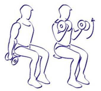 Sentado en posición vertical, sujeta una mancuerna con cada mano y realiza una flexión de codo moviendo sólo el antebrazo hasta que llegue al pecho.