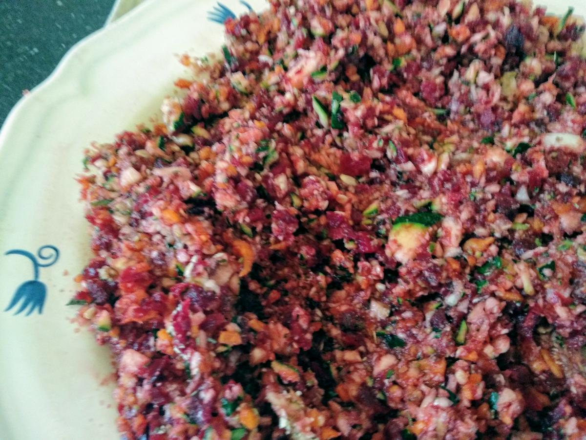 Tritura en una batidora potente o ralla finamente los diversos vegetales y hortalizas.