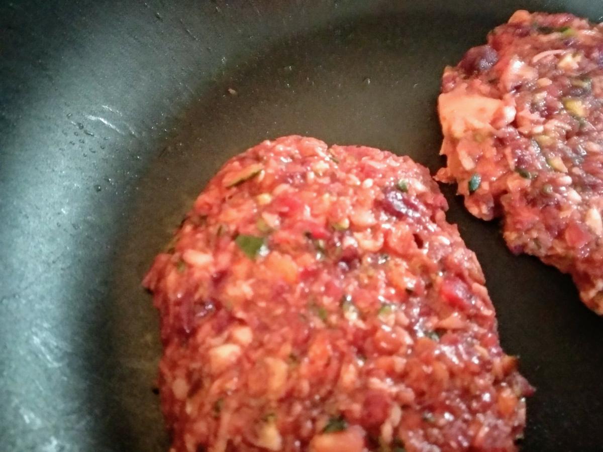 Pica el ajo y la cebolla tierna y mezcla con las verduras, los huevos (o el psyllium husk, o tu huevo vegano), las hierbas y el resto del condimento. Una vez bien mezclada, podemos guardar en la nevera durante una hora, eso también facilitará que las hamburguesas tengan más consistencia. Prueba la masa y rectifica el condimento si fuera necesario.