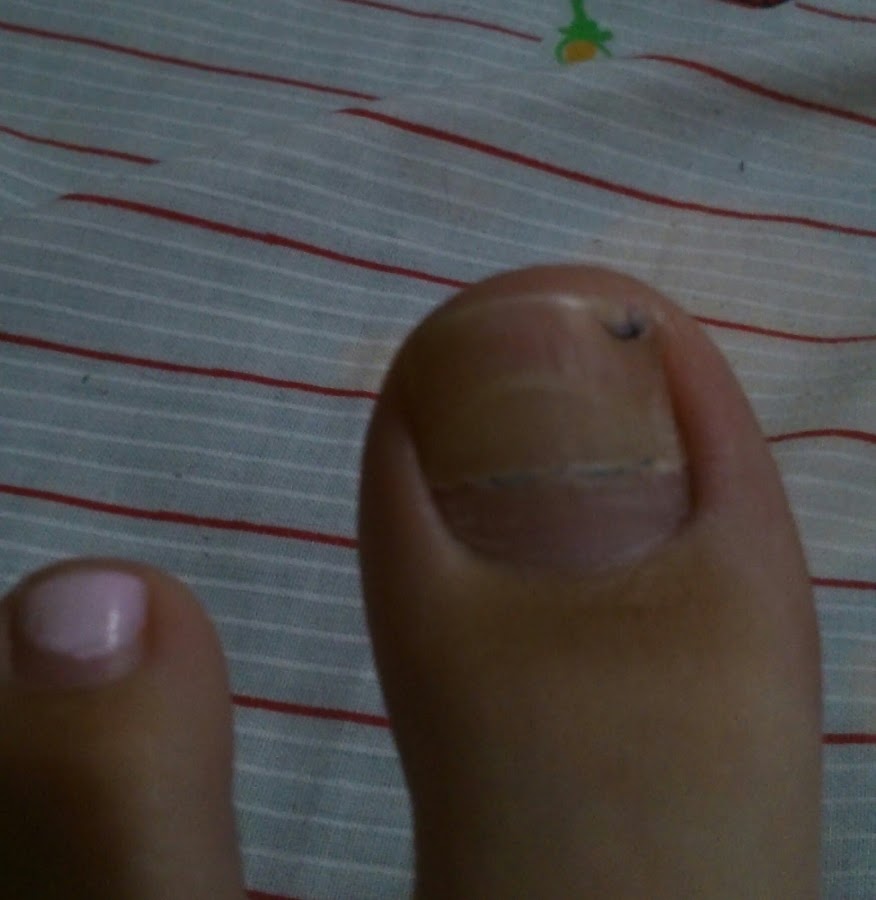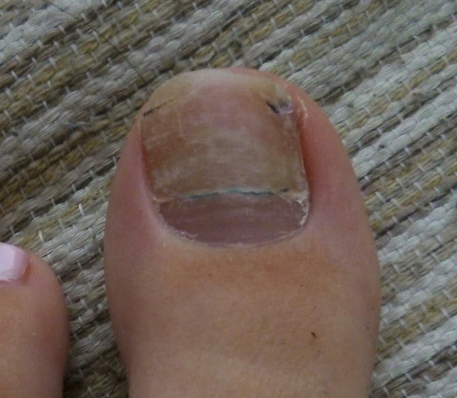 Este aspecto tenía mi uña después de aplicar el remedio por primera vez. Puede parecer que tiene un aspecto aún más enfermo que en la primera fotografía pero si os dais cuenta en esta podemos apreciar mejor aún los síntomas del hongo, pues hemos conseguido que desaparezca uno de los síntomas que era el horroroso color amarillento.