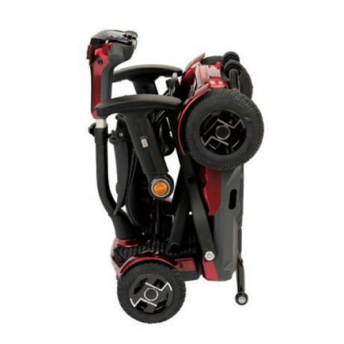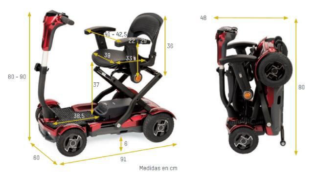Otra cosa que diferencia este scooter de los scooter plegables pequeños es que su brazos son regulables en altura. Incorporan un botón en el eje de rotación que dentro de que no se pueden hacer regulaciones ni adaptaciones especiales, permite regular la altura de los brazos para mantenerlos correctamente apoyados dando descanso a la tensión de los hombros y codos que se origina cuando llevamos los brazos en tensión durante un largo recorrido o muchas horas de conducción.Estos mismos reposabrazos se abaten en su totalidad hacia atrás dejando toda la amplitud del asiento que tiene un ancho de 41 cm, para permitir realizar transferencias libres de obstáculos o reposabrazos que interfieran en la acción.