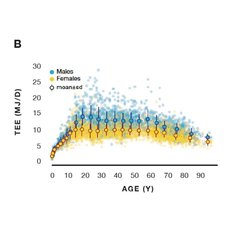 Por ejemplo, en esta imagen tomada de uno de los estudios reverenciados, se puede notar claramente como el gasto energético total (TEE) se mantiene estable a lo largo de toda la vida adulta, y no es hasta los 70-90 años que disminuye un poco: