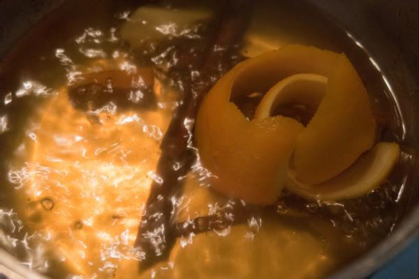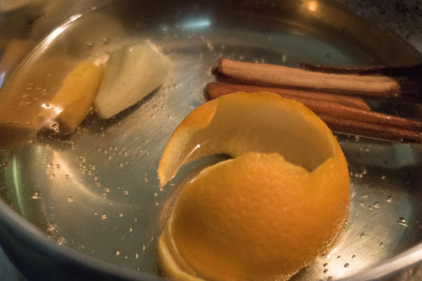 En una olla o cacerola pequeña, añadir el agua, con el jengibre, la cúrcuma, la canela y la cáscara de naranja y poner a hervir hasta que el agua cambie de color, más o menos anaranjado (producto de la cúrcuma, principalmente).