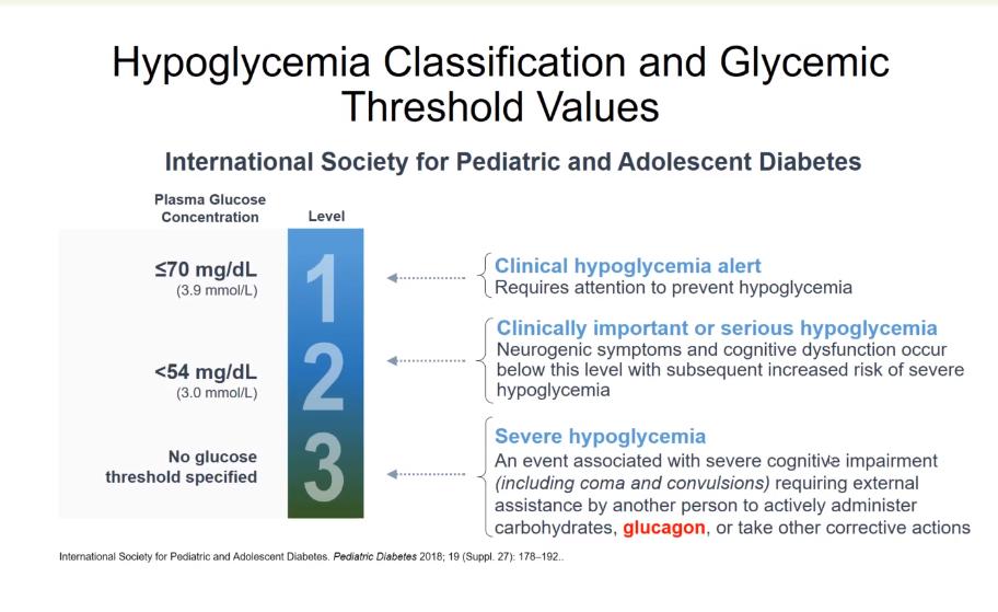 Para comenzar a hablar de él, es importante entender cómo la Sociedad Internacional de Pediatría y Adolescentes con diabetes define la hipoglucemia. Pues bien, como veréis en la foto establecen 3 niveles: