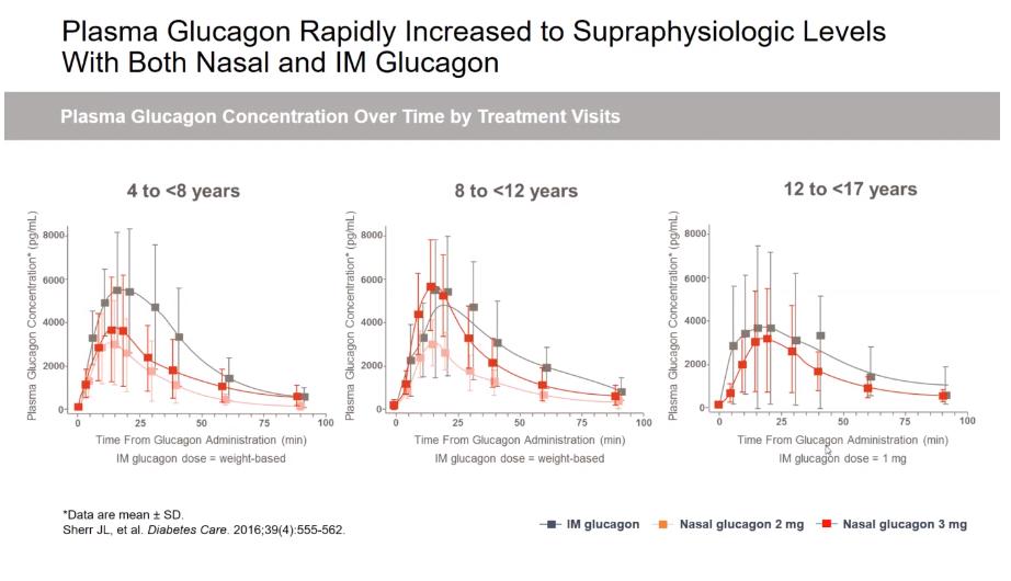Mientras que en las dos siguientes y para los que aún sigan con dudas, en estas son imágenes podéis ver como el glucagón tradicional intramuscular y el nasal tuvieron una respuesta muy similar en la subida de glucosa.