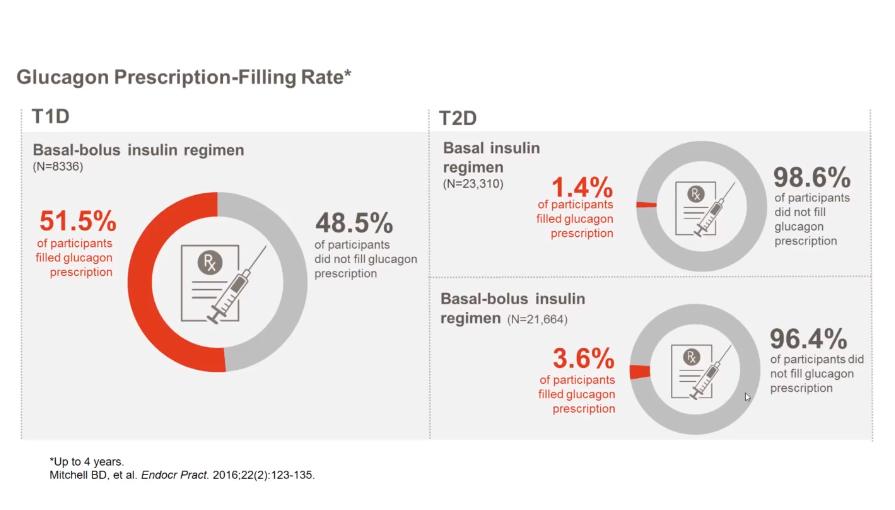 Sin embargo y a pesar de lo necesario que es, en un estudio realizado a pacientes tipo 1 y tipo 2, solo un 51,1% del total de pacientes con DT1 tenía prescripción de glucagón, mientras que ese porcentaje se reducía notablemente en el grupo de DT2, teniendo prescripción solo el entre el 1,4% y el 3,6% (ambos grupos con terapia de insulina). Datos alarmantes teniendo en cuenta que el glucagón nos puede salvar la vida.
