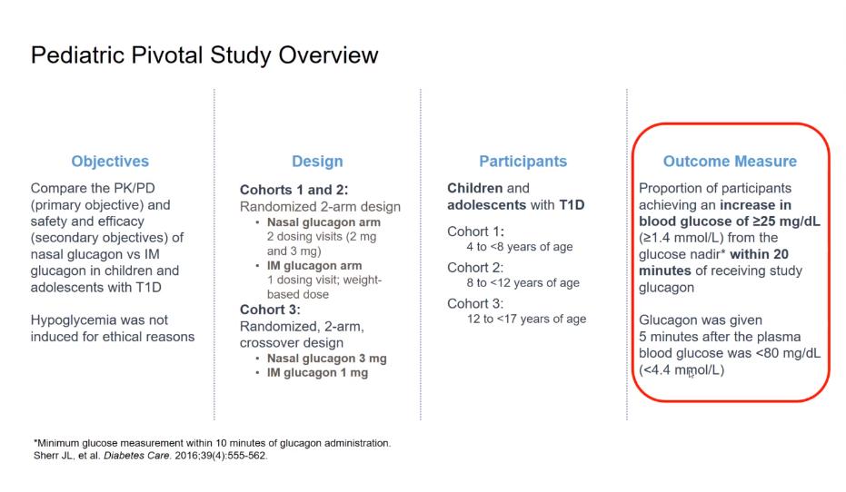 Pero ¿es este glucagón nasal para todos los pacientes? En principio estaría aprobado para todos los pacientes adultos y pediátricos si vemos las siguientes dos imágenes donde en todos se consiguieron buenos resultados, pero poniendo foco en los pacientes pediátricos (segunda foto) de las 3 cohortes que hicieron y que iban desde los 4 a los 17 años, un gran volumen de pacientes consiguieron aumentar sus niveles de glucosa en 25mg/dL dentro de los 20 minutos posteriores a la administración del producto, mientras que el 100% de todos ellos consiguieron alcanzar un estado de normalidad y volver a valores estables, dentro de los 30 minutos posteriores a la aplicación.