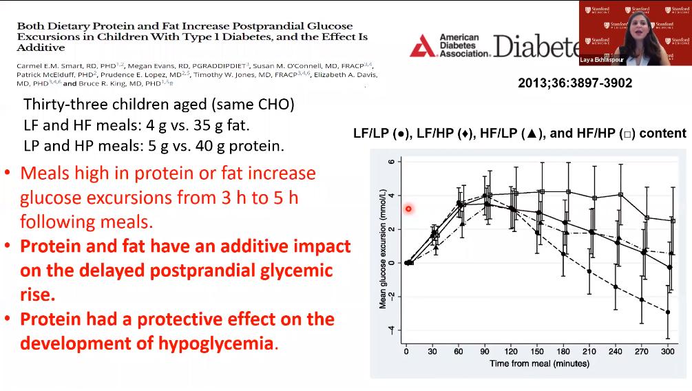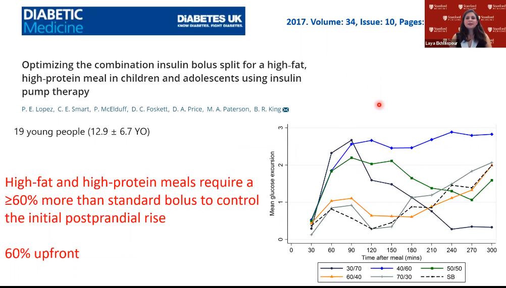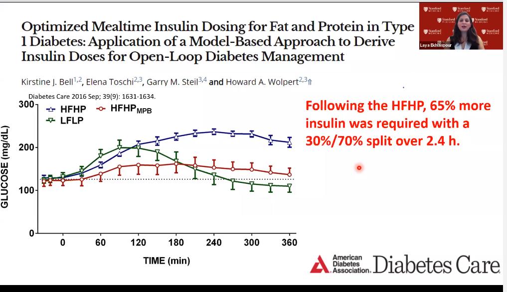 Mientras que el segundo estudio presentado se observa que en comidas con alto contenido en grasa y en proteínas (HFHP) se requiere de al menos un 60% más de la insulina habitual, y de ese total de unidades que nos dé, al menos un 60% al inicio para controlar la subida inicial, reducir las probabilidades de hipo intermedias y posteriormente aplicar la segunda parte de las unidades totales calculadas.