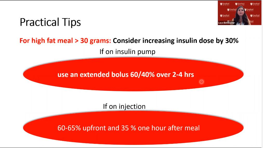 Si estás usando bolis de insulina, la ponente recomienda incluir un bolo adicional de insulina a la hora de hacer estas comidas para corregir la subida tardía que provocan las grasas y las proteínas.