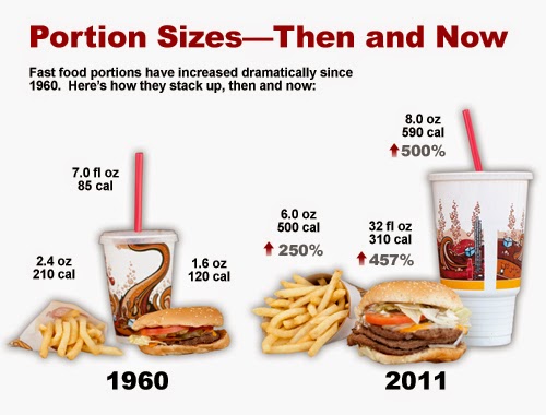 Me parece curioso que en establecimientos de comida rápida y en los cines, nos resulte pequeño el menú pequeñode palomitas, refrescos, patatas o hamburguesas cuando este mismo menú era el que se consideraba grande (o gigante) hace 20-30 años. Para que veáis la diferencia de lo que comíamos hace nos años con lo que comemos ahora y la percepción de normalidad que tenemos y teníamos de ambas cosas, os pongo a continuación una serie de fotos.