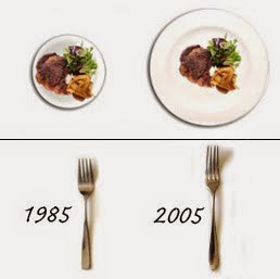 No sé si os habréis dado cuenta de que muchas de las vajillas que actualmente se venden son más grandes que las que se vendían hace unos años, incluso me arriesgo a pensar que el plato pequeño es el que antes se consideraba grande, y... ¿cuál es el problema de esto? Por lo general, comemos por los ojos, necesitamos ver el plato lleno para sentirnos saciados (no mucha gente escucha a su cuerpo mandar la señal de saciedad, y muchos otros aunque lo notan siguen comiendo por gula), de tal manera que si antes comíamos un filete de pollo del tamaño de nuestra mano (ración normal de consumo) y cabía perfectamente en el plato, hoy en día este mismo filete parece pequeño en el plato, por lo tanto tendemos a consumir un filete más grande y, por tanto, comemos una ración más grande de la que nos corresponde.