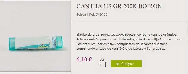 - Si se observan las páginas web antes mentadas, muchas de ellas coinciden en la mayoría de los "brebajes". Así por ejemplo el Cantharis es el rey de los remedios renales homeopáticos. Pues nos vamos a centrar en él como ejemplo simbólico?