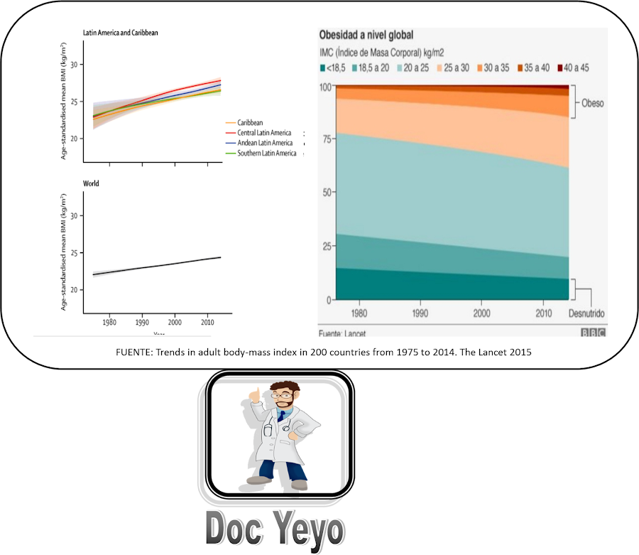 - Durante la semana pasada la Revista Lancet, compartió un artículo que muestra el comportamiento de la epidemia de Obesidad Mundial. De 1975 a 2014, la obesidad creció en los hombres de un 3.2% a 10.8% y en mujeres un 6.4% a 14.9%; mientras que en Desnutrición los datos fueron de disminución: 14% a 9% en hombres y 15% a 10% en mujeres.