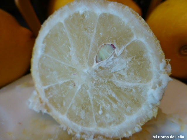 Así que lo tengo como costumbre, al levantarme tomo el agua caliente con el zumo y ya al tiempo desayuno. El limón congelado lo incluimos en muchos platos y nunca faltan en el congelador.