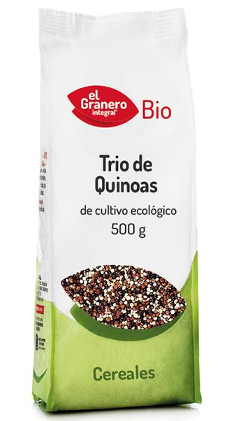 En el mercado también hay bolsas que contienen quinoa de los tres colores, como por ejemplo la de la casa El granero Integral que podemos ver en la foto de la derecha, y que tiene una bolsa llamada Trío de quinonas. Esto se hace haciendo la mezcla con las 3 variedades que he mencionado antes, cada planta hace un tipo de quinoa y las empresas son las que las mezclan.