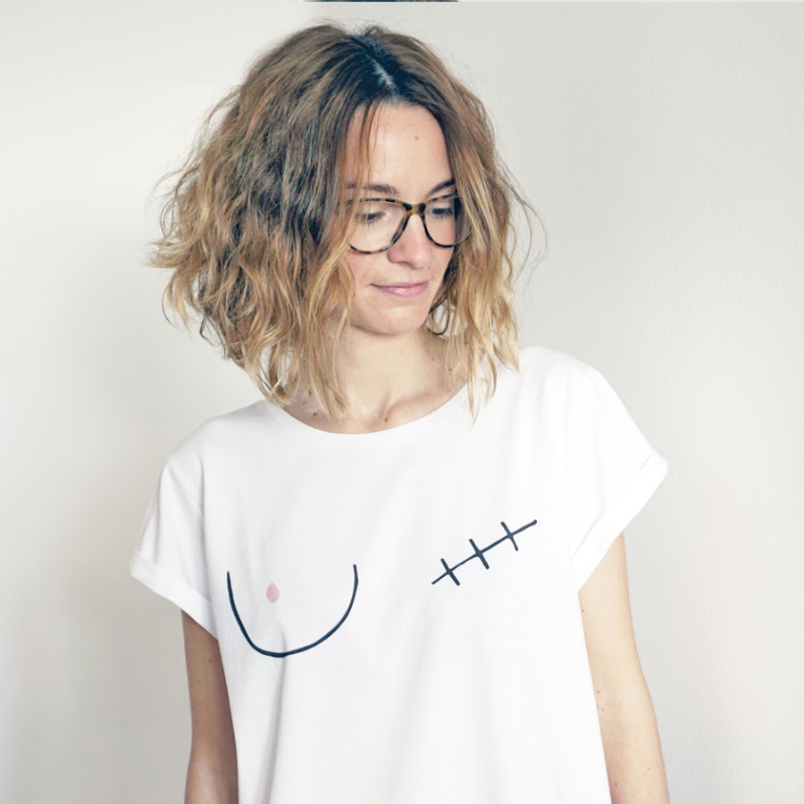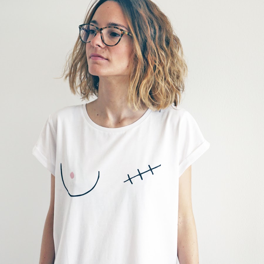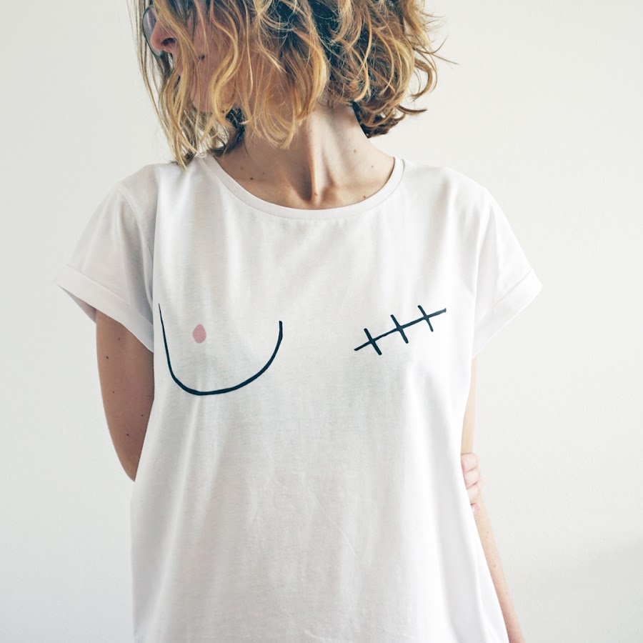 Para hacer la camiseta han aprovechado uno de los diseños más vendidos de la marca de moda española OFFSET COLLAGE con un pequeño cambio: en lugar de haber dibujado dos pechos, hay un pecho y una cicatriz (como se puede ver en la imagen adjunta).