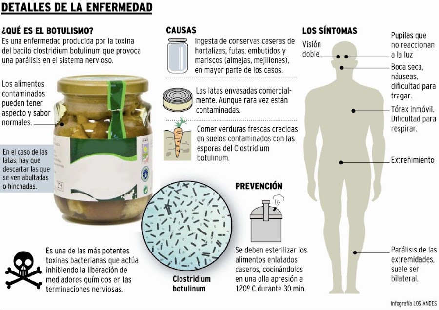 El desenlace fatal (en general el primer caso que no se diagnosticó oportunamente de un brote) ocurre a las 24-48 horas del comienzo de la enfermedad. En el botulismo intestinal del lactante la sintomatología tiene un amplio espectro. Es constante la tríada: hipotonía, constipación y reflejo fotomotor lento. La primera manifestación es la constipación. Varios días después se presentan la hipotonía muscular y la disminución de la fuerza que son progresivas y provocan la insuficiencia respiratoria. Es fundamental generar la educación de las personas que preparan alimentos caseros para su conservación respecto a: