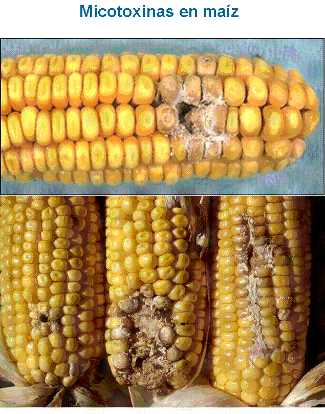 Las fumonisinas son un grupo de al menos 15 micotoxinas producidas principalmente por los hongos Fusarium verticilliodes y F. proliferatum, las cuales se en cuentran frecuentemente en todas las re giones productoras de maíz a nivel mundial. Existen al menos tres fumonisinas de ocurrencia natural: se conocen como FB1, FB2 y FB3. La FB1 es siempre la más abundante, seguida por la FB2 y la FB3. Generalmente estas toxinas se encuentran en los alimentos en concentraciones de partes por millón (miligramos por kilogramo). Este tipo de micotoxinas producen una gran variedad de efectos en los animales; leucoencefalomalacia (reblandecimiento de la sustancia blanca del cerebro) en equinos, edema (hinchazón) pulmonar en porcinos, así como toxicidad del riñón (neurotoxicidad) y cáncer de hígado en ratas.