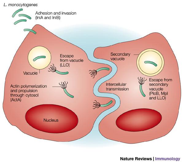La bacteria atraviesa la barrera intestinal y es internalizada por los macrófagos en los que sobrevive (por acción de la listeriolisina O) y se multiplica en una hora. Se desplaza intracitoplasma rodeada por filamentos de actina celulares, organizados como la cola de un cometa, hasta llegar a la membrana celular. Ésta forma protrusiones con una bacteria en el extremo que, a su vez, son internalizadas por las células vecinas. Alcanza los ganglios linfáticos regionales. En el hígado y el bazo, la respuesta de células T, limita la infección. Si ello no ocurre, L. monocytogenes tiene como principal blanco los hepatocitos. También invade macrófagos, fibroblastos y células epiteliales. Es uno de los microorganismos con mayor capacidad de invasión.