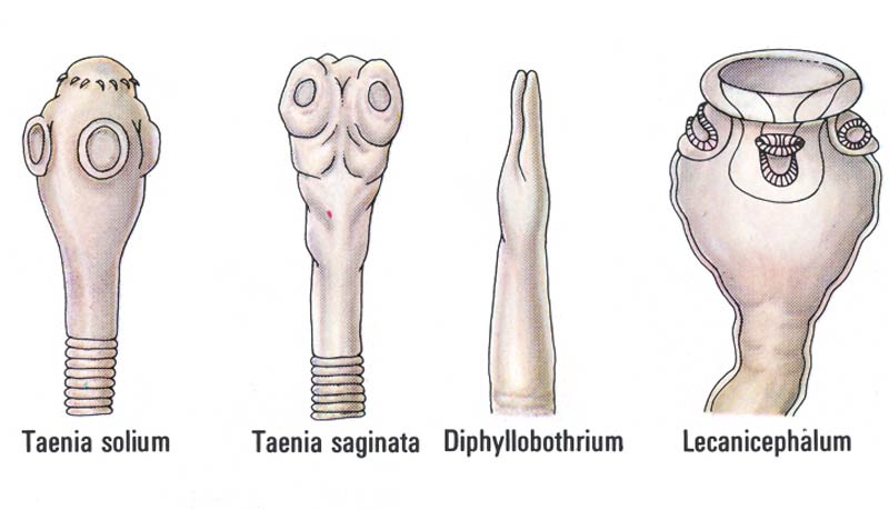 Cuando el hombre ingiere un cisticerco, el escólex se libera en el intestino, se fija a sus paredes, y proliferando, origina una serie de proglótidos. T. solium mide tres metros y medio y T. saginata, de siete a ocho; Dibothriocephalus latus (la mayor tenia conocida) hasta quince, con 4.000 proglótidos. El cisticerco de esta última vive en peces de agua dulce. Además de estas solitarias posee el hombre los cisticercos de algunas otras cuyos adultos viven en el intestino de otros animales. La más notable de éstas es la T. echinococcus, insignificante tenia (cinco milímetros como máximo) del intestino del perro, cuyo cisticerco se desarrolla de preferencia en el hígado humano, alcanzando enormes dimensiones y produciendo el quiste hidatídico (Hidatidosis humana).